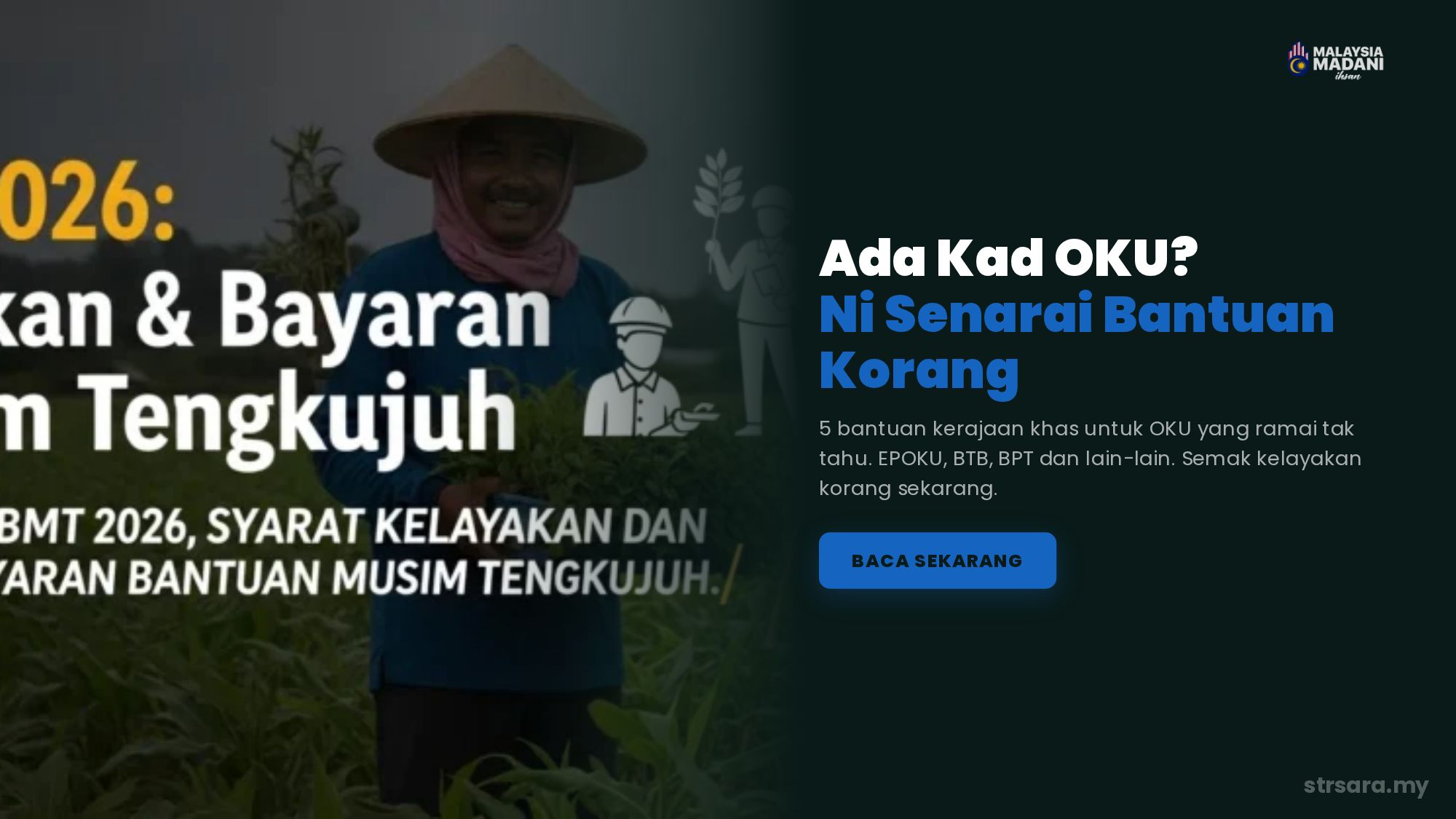 Korang ada Kad OKU atau keluarga korang ada? laman web STR SARA Ramai yang tak tahu sebenarnya kerajaan ada banyak bantuan khas untuk golongan OKU. Bukan satu dua je, tapi ada sampai 5 jenis bantuan yang korang boleh mohon sekarang.