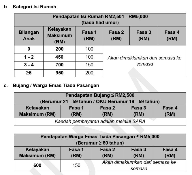 Nota: Penerima yang layak akan menerima bantuan berdasarkan kriteria ini. Pembayaran adalah berperingkat, mengikut kategori kelayakan.