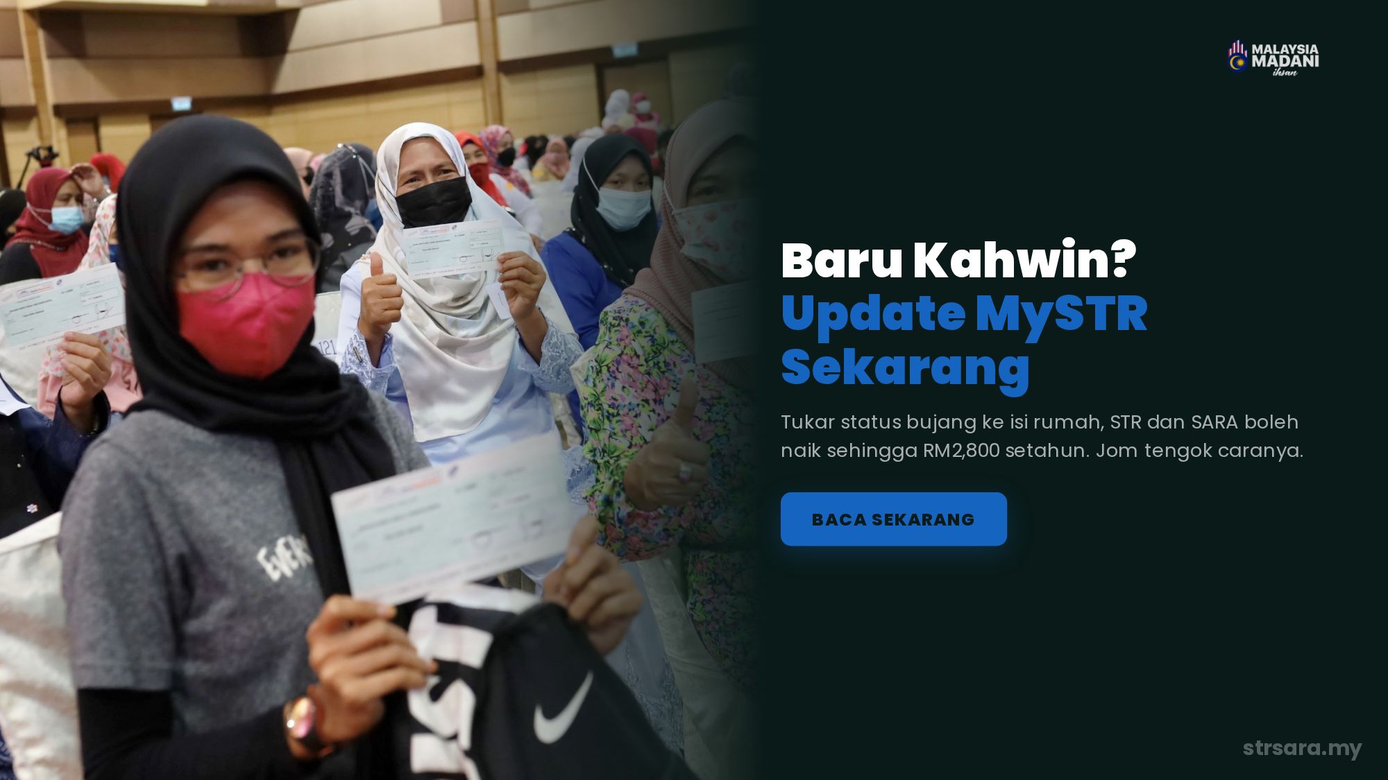 Sistem MySTR tak auto-detect yang korang dah kahwin. Korang kena masuk portal dan kemaskini sendiri. Bantuan STR SARA Selagi korang tak buat, bantuan STR dan SARA yang korang terima masih ikut kadar bujang.